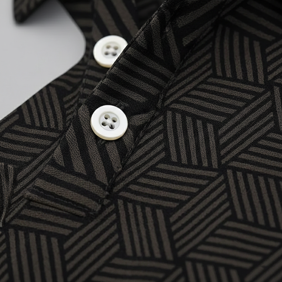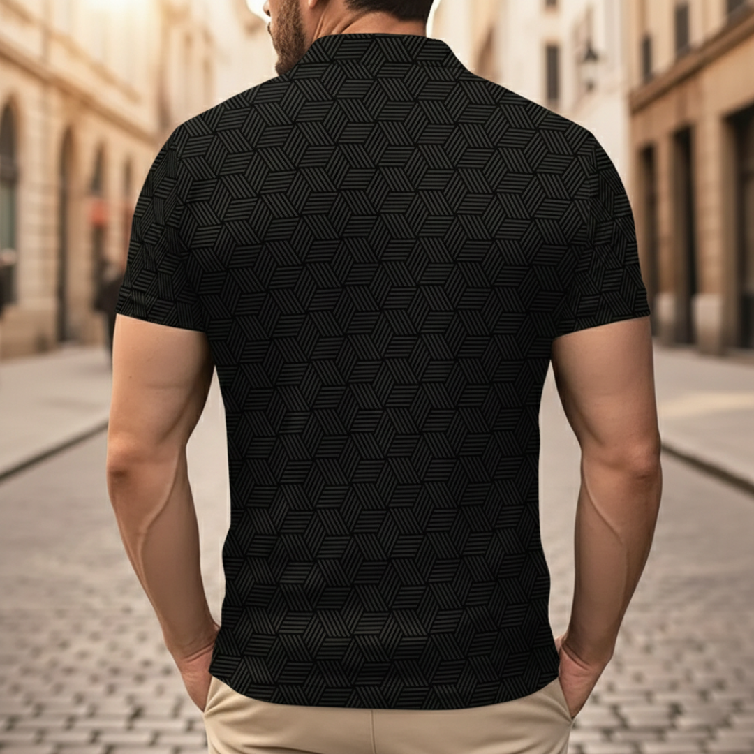 Men’s geometric print knit polo shirt designed for adult male wear. The shirt features a geometric pattern and a classic polo collar, offering a structured appearance suitable for casual and smart-casual use.