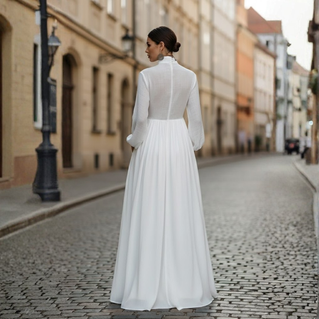 Robe longue en coton et lin patchwork col montant manches longues pour femme