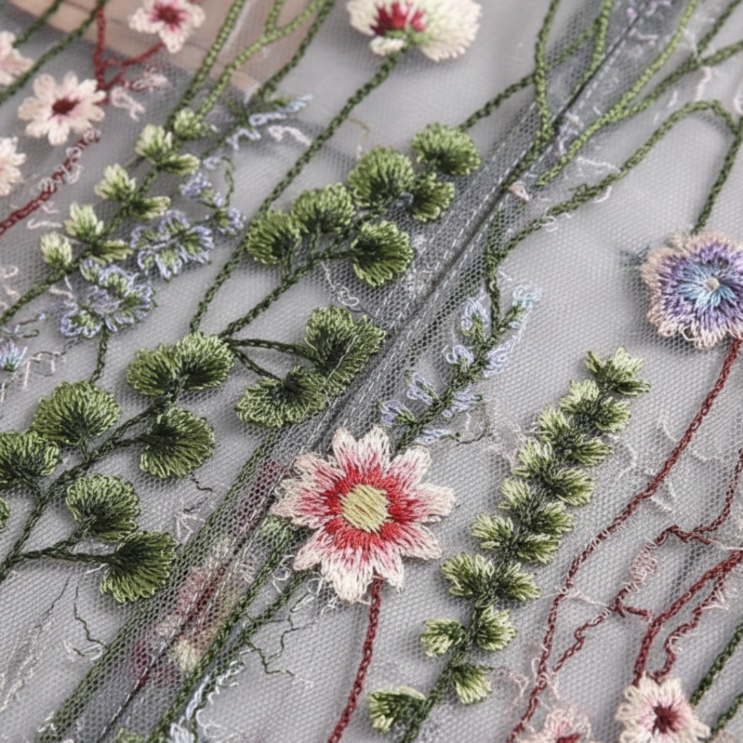 Cette robe maxi pour femmes est fabriquée en maille polyester avec broderie florale. Elle présente une couche extérieure semi-transparente avec une doublure intérieure pour la couverture et le confort. La robe est conçue pour les femmes adultes et a une longueur maxi adaptée aux tenues formelles et d'occasion.